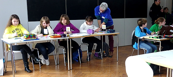 Im Musikpavillon präsentierten die Sechstklässler Unterricht zum Anfassen. Waffeln zum Selberbacken und die ganze Angebotspalette des Projektnachmittags gab es in der Pausenhalle, inklusive Mini-Klettertour und Töpfer-Werkstatt. Das Ausprobieren und Mitmachen setzte sich sowohl im Mehrzweckraum mit künstlerischen Anregungen zum Gestalten eines Kreisel-Kunstwerks fort wie