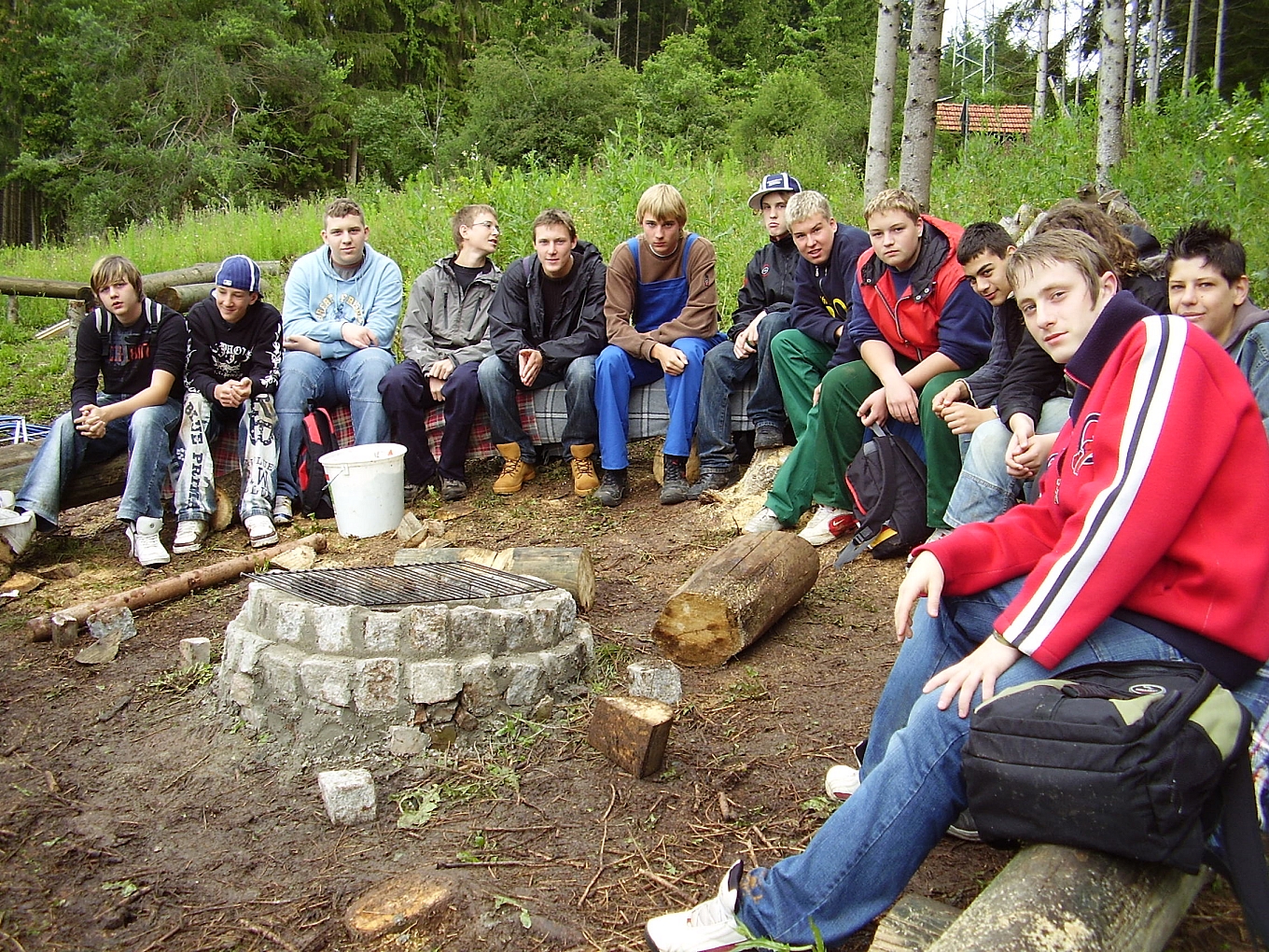 Projekttage der Konrad-Witz-Schule im Wald (27.−29. Juni 2007) 17 Schüler und eine Schülerin der achten und neunten Klassen waren an zwei Tagen im Wald unterwegs. Schulsozialarbeiter Manfred Allgaier und Lehrer Hardy Schwarz begleiteten die Jugendlichen und leiteten sie an: beim Mauern der neuen Grillstelle mit Sitzgruppe und auch beim Bauen eines Unterstands auf einem Waldgelände bei Neufra, in dem regelmäßig erlebnispädagogische Vormittage mit Schulklassen unter Leitung des Schulsozialarbeiters und Erlebnispädagogen Allgaier statt finden. Zu dem grünen Klassenzimmer, dass sich dort bereits befand, kamen nun auch Spielgeräte wie ein Tarzanseil oder Schwebebalken dazu. |