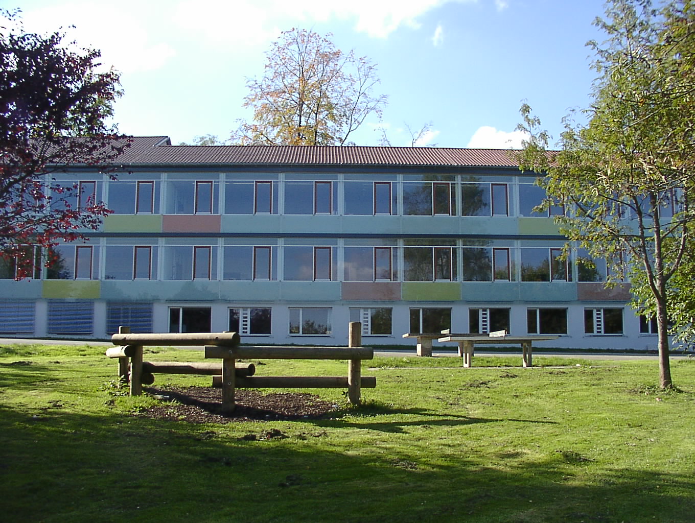 Ein Hauptgebäude, ein Fachraumgebäude und 3 Pavillons bildeten die Seiten eines Dreiecks, dessen Mittelfläche eine Obstbaumwiese bildete – und noch heute bildet.