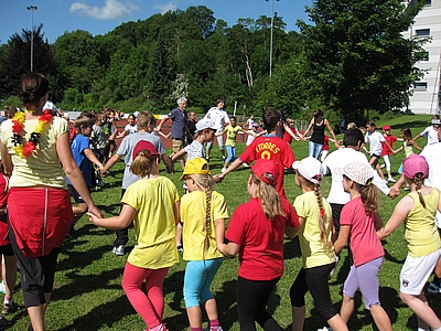 Zum farbenprächtigen Abschluss des Sporttages versammelten sich alle