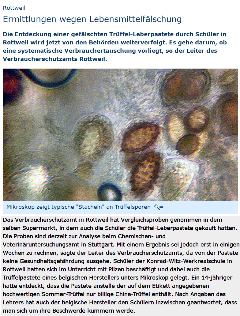Ein 14-jähriger Schüler hat in Rottweil einen mutmaßlichen Lebensmittelbetrug aufgedeckt. Er hat bei einer Leberpastete festgestellt, dass sie nur billige Chinatrüffel