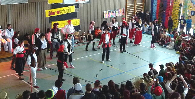 Piraten aus der Karibik die begeisterte Schülerschar mit einem flotten Darbietung.