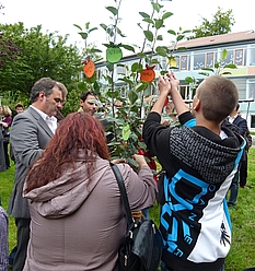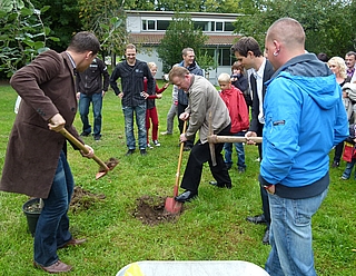 Väter pflanzen einen neuen Apfelbaum für ihre Kinder in der Streuobstwiese, Eltern hängen die Namensschilder ihrer Kinder an den Baum.