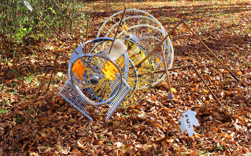 Die erste Ameise stellt eine eher technische Auseinandersetzung mit dem Insekt dar. Hierbei dienten alte Fahrradfelgen als Ausgangsmaterial (60cm, 60cm, 150cm).