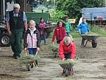 In Kleingruppen verarbeiteten die Kinder selbst Schafwolle: Sie kämmten die Schafwolle mit Karden und probierten das Spinnen der Schafwolle am Stöckle.