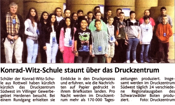 Im Rahmen des Kulturtags besuchten Siebt- und Acht-Klässler sowie Schüler der Vorbereitungsklasse das Druckzentrum des Schwarzwälder Boten in Villingen-Schwenningen. Nach einer kurzweiligen Filmvorführung wurden sie durch die verschiedenen Arbeitsbereiche des Druckzentrums geführt. Dabei beeindruckte vor allem die Arbeitsgeschwindigkeit einiger Maschinen.