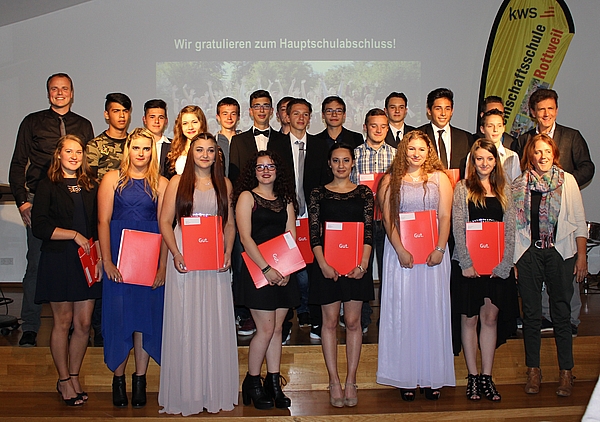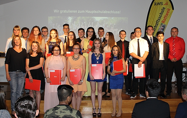 Alle Schüler der Kooperationsklasse Werkrealschule-Berufsschule 10K mit ihrer Klassenlehrerin Franziska Kilian erreichten ihre Abschlüsse und damit die Anschlüsse an eine Berufsausbildung. Die Kooperationsschüler besuchten nach Klasse 8 den zweijährigen Bildungsgang, der von der Konrad-Witz-Schule und der Nell-Breuning-Schule gemeinsam getragen wird und in dem der Hauptschulabschluss erreicht wird. Nun stehen alle beruflichen und schulischen Wege offen.