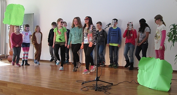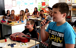 Drei Wochen vor den Ferien – da schalten manche schon ab. Nicht so die Lerngruppe 5a in Englisch. Die dreht erst richtig auf! Mit multimedialer Unterstützung – dem neuen Ultra-Kurzdistanzbeamer, Audiosystem, Mikrofon und Gitarre – gestalten die Schülerinnen und Schüler unter der Leitung von Herrn Schleeweiß die verschiedenen Dialoge, Reime, Präsentationen und sogar Raps auf ansprechende Weise. |