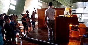 Noch bevor Wolfgang Weis einige Dinge zum Instrument und zu seiner Person sagen konnte wurde er bereits von der Neugier der Schülerinnen und Schüler überrascht. Mehrere Fragen, die erkennen ließen, wie scharf die Schülerinnen und Schüler bereits das musikalische Erlebnis beobachtet und aufgenommen hatten, wurden gleich beantwortet. Dies stillte jedoch noch nicht den Wissensdurst. In einem kurzen Vortrag knüpfte Wolfgang Weis an die Fragen und an das Vorwissen der Schülerinnen und Schüler an. Mehrere zentrale Lerninhalte zur Spielweise, Funktion, sowie zum Bau des Instruments und dessen musikalischen Einsatzmöglichkeiten ergaben sich in einem lebhaften Dialog zwischen den Schülerinnen und Schülern und dem lokalen Experten. Sogar Vertreter der verschiedenen Pfeifenarten kamen den Schülerinnen und Schüler zum Greifen nah – Herr Weis hatte mehrere Modelle zum Anfassen organisiert. Weiter ging es dann mit mehreren Blicken ins Innere der verschiedenen Register der Orgel.