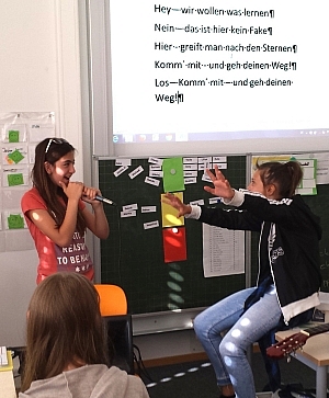 Dazwischen rapt Herr Schleeweiß im Wechsel mit der Klasse und trainiert dabei wichtige Elemente der Aussprache. |