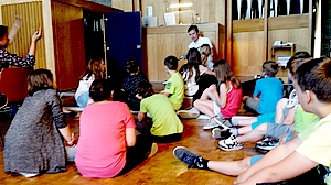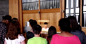 Klängen begrüßt, die Organist Wolfgang Weis dem Instrument entlockte. Sofort stellte sich eine interessierte Stille ein und die Schüler lauschten den verschiedenen Registern, die Herr Weis in seiner Improvisation zur Geltung brachte. Gespannt ging es dann die Treppen zur Empore hoch, um den Klängen weiter auf die Spur zu kommen. Oben angekommen formten die Schüler den zuvor geübten Halbkreis, damit jeder die Chancen hatte, das Lernerlebnis voll auszunutzen. Der Organist beendete dann stilvoll seine Improvisation und begrüßte die gespannten Zuhörer.