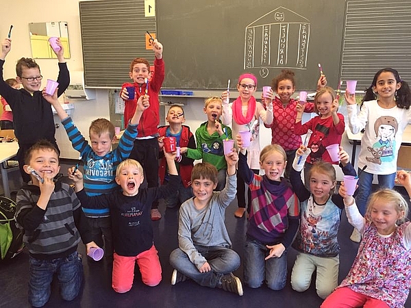 In der gemeinsamen Einführungsstunde im Klassenzimmer erfuhren die Schülerinnen und Schüler, wie man die Zähne durch richtiges Zähneputzen, regelmäßige Zahnarztbesuche und durch zahngesunde Ernährung ein Leben lang gesund halten kann.